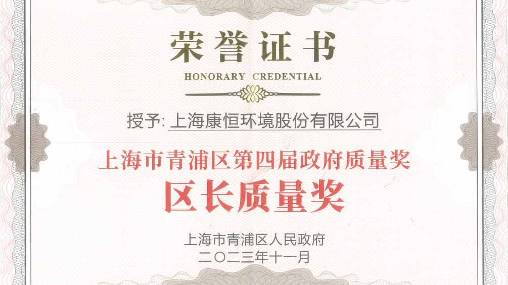 11月27日,康恒环境荣获第四届青浦区区长质量奖(组织)。