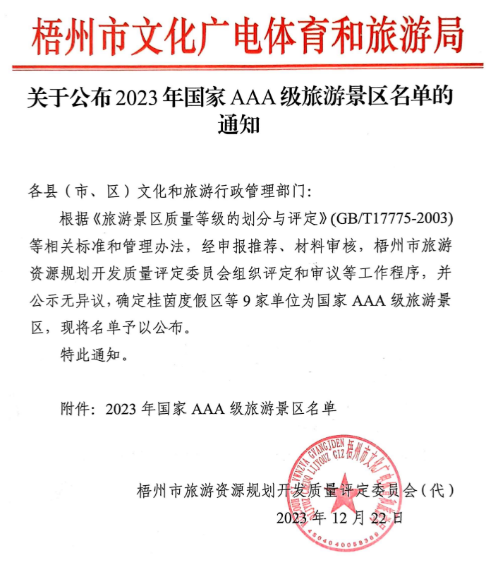 12月22日,梧州项目正式通过广西自治区旅游景区验收专家组评审检查,获评为"国家AAA级旅游景区"。