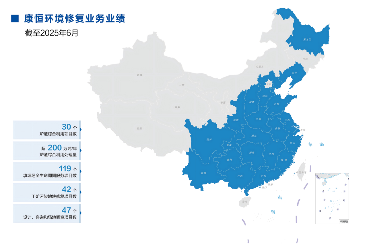 上海康恒环境修复有限公司(“康恒修复”)是康恒集团于2014年开始孵化的全资子公司,为应对各类严峻的环境挑战,康恒环境以“填埋场全生命周期服务+次生固废资源化+工矿污染地块修复”等三大领域,提供环境调查咨询、修复方案设计、整治工程实施、设备制造与租赁、药剂研发生产、固废设施投资运营等一站式综合服务,持续改善人居环境。