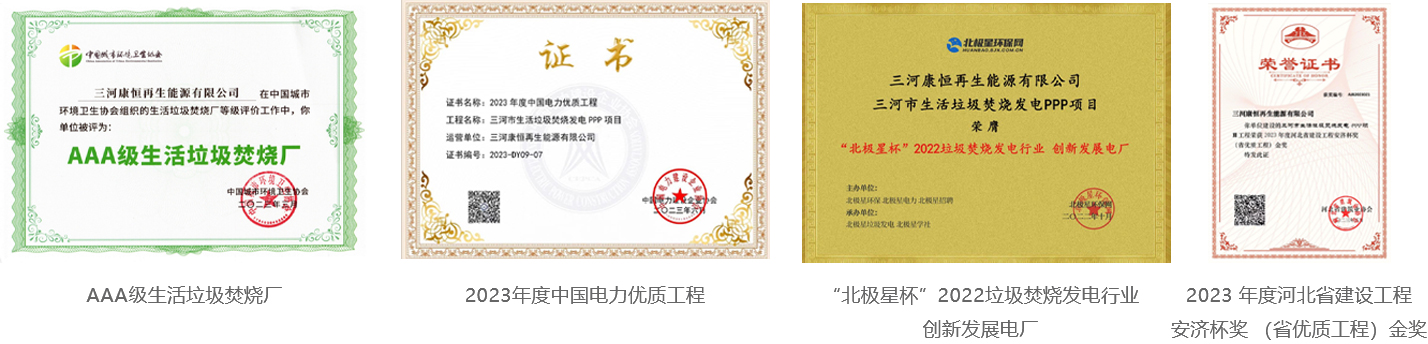 三河项目已通过质量、环境、职业健康安全管理体系认证及生活垃圾焚烧厂运营服务认证,获评国家AAA级生活垃圾焚烧厂。